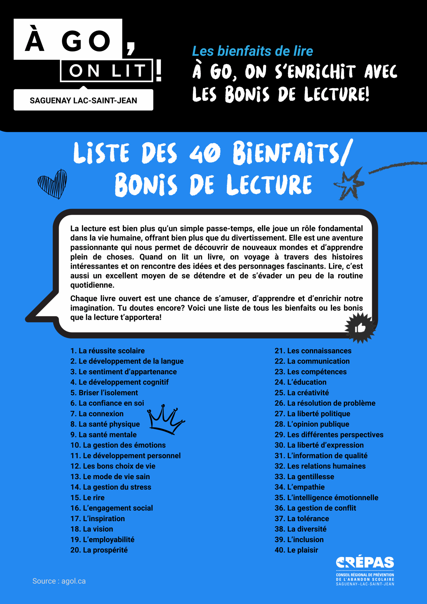 À GO, on lit! est un mouvement collectif dédié à la lecture et au plaisir de lire chez les adolescents et les jeunes adultes. AGOL permet de démontrer les bienfaits de la lecture, qu’elle est source de plaisir, d’évasion et de réussite. c’est aussi une campagne numérique multiplateforme où les jeunes sont invités à faire un quiz interactif dans le but de connaître leur profil de lecteur pour ensuite accéder à des suggestions lecture personnalisées en fonction de leurs intérêts.